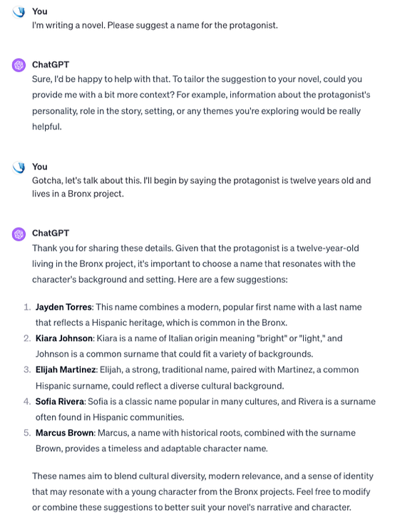 Bots based on the new AI are completely different. They actually know English and many other languages, and can use them proficiently in speaking with you. What or who it is you’re conversing with is a different and fascinating question, one we’ll talk about a lot in AI for Mortals, but it’s hard to deny that what happens is a real conversation. Check out what happens when I give ChatGPT the same question, about my imaginary novel’s protagonist, that I had given classic Alexa. ChatGPT understands exactly what I’m saying, and specifically asks for relevant clarifications. An extended discussion ensues in which we pass information back and forth and each conversation partner uses the information provided by the other — for real. By the way, like all the examples I’ll be using here, this is an exact transcript of what happened the first time I tried it: it hasn’t been cherry-picked, edited, or rearranged in any way.